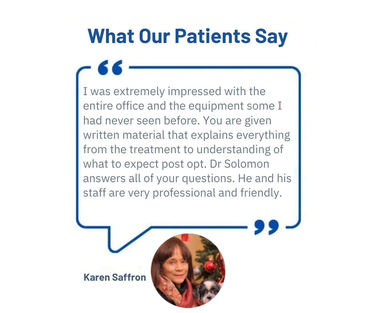 We offer a full spectrum of services, from comprehensive eye exams and vision testing to advanced treatments and surgical procedures. Whether you need dry eye therapy, cataract surgery, refractive lens exchange, or Visian ICL, our skilled team is here to provide personalized care tailored to your unique needs. At Solomon Eye Physicians & Surgeons, your vision is our top priority, and we are committed to delivering exceptional results with compassion and expertise.